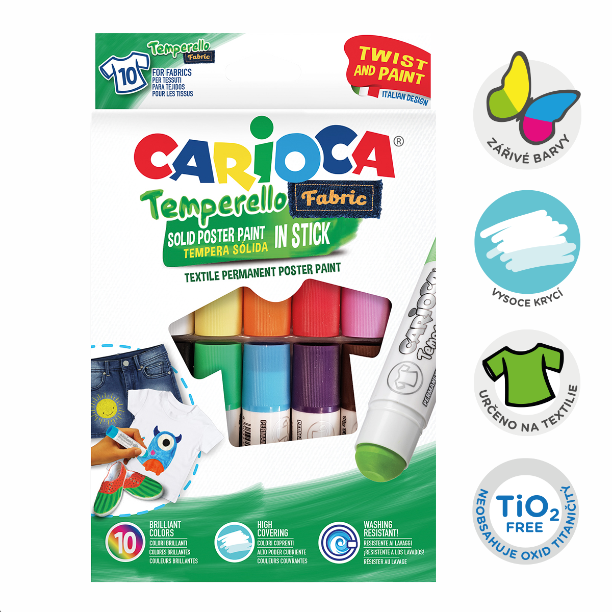 Vytvořte si jedinečné módní kousky s temperovými barvami na textil od italské značky Carioca. Praktické balení v tyčince pro nanášení barev. Skvělá zábava pro všechny bez ohledu na věk!
