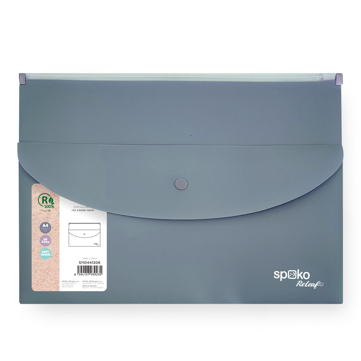 Spoko ReLeaf je ekologická řada produktů značky Spoko, která přistupuje zodpovědně k životnímu prostředí a při výrobě svých produktů využívá převážně recyklované materiály. Řada archivačních doplňků SoftTouch je vyrobena ze 100% recyklovaného PP. Díky tomu má i nezávislou certifikaci Global Recycled Standard.
