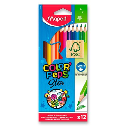 Souprava 12 kusů pastelek s veselým designem. Ergonomické pastelky Maped Color'Peps mají trojhranné tělo, měkkou odolnou tuhu a jasné barvy.