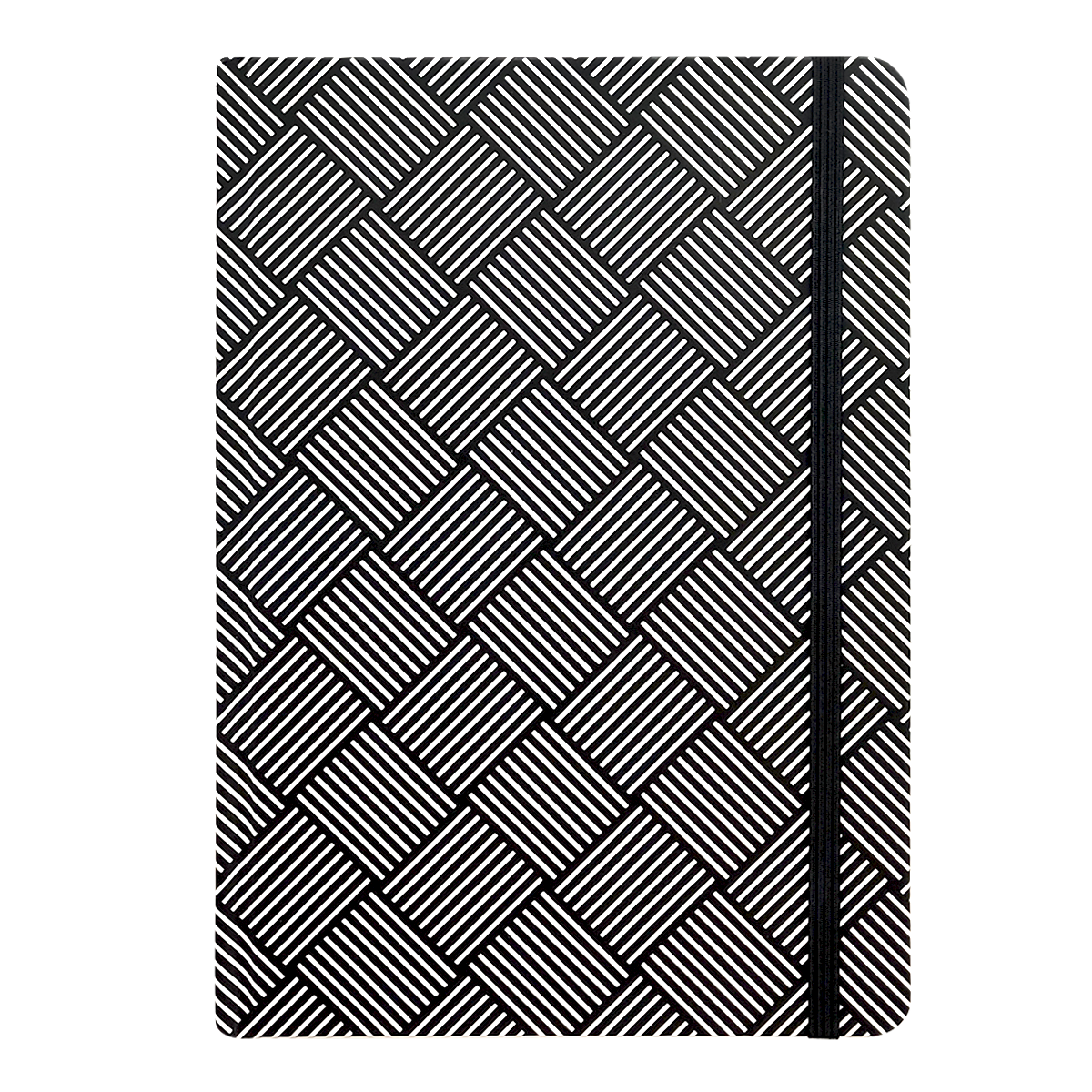 Praktický zápisník s geometrickým motivem v kontrastních barvách černé a bílé.